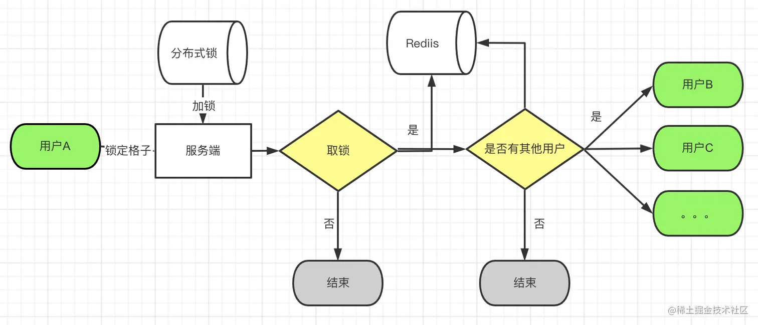 - 服务端根据 「excel_id和当前单元格坐标」 取锁,取锁成功进行下一步;如果取锁失败,给当前用户返回此单元格正在被A用户编辑