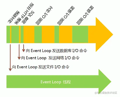 I/O操作时,主线程会让Event Loop通知响应的I/O程序。继续向后运行,所以不存在红色的等待时间。等待I/O程序执行完成后,Event Loop 线程再把结果返回主线程。主线程调用事先设定的回调函数,完成整个任务。
