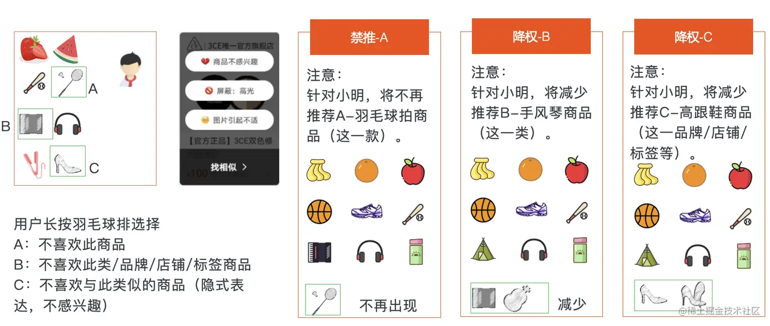 推荐系统在与用户互动的过程中,有可能出现不符用户预期的推荐结果,而负反馈成为推荐与用户对话的重要入口。智能推荐支持单个商品维度、商品类目维度以及商品其他特征类维度的负反馈功能。
