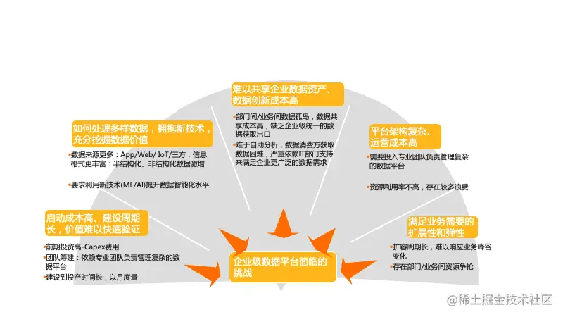 企业为了使用数据驱动业务发展,在建设和运营企业数据仓库时面临的问题: