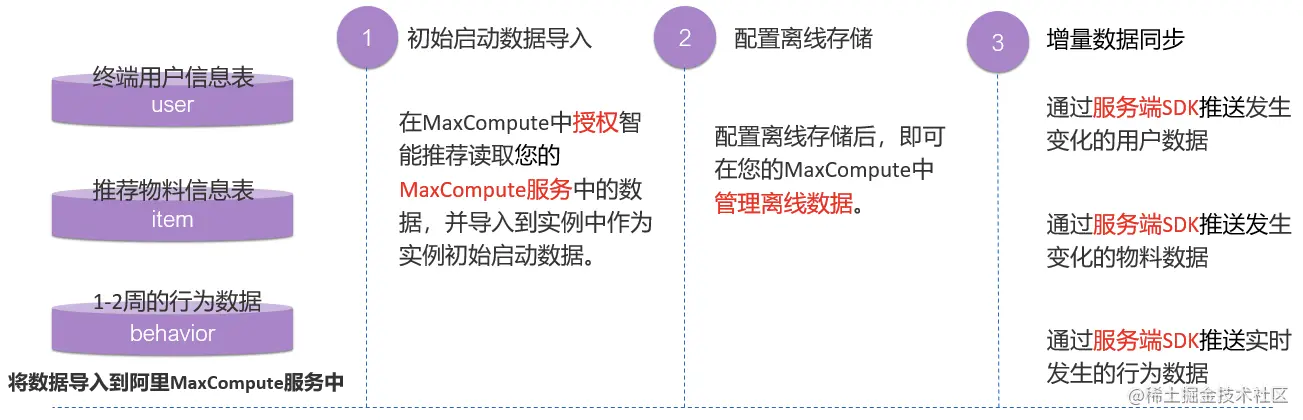 智能推荐是典型的大数据应用场景,所以强依赖于数据仓库。智能推荐在数据对接方面,基于MaxCompute来实现,通过应用MaxCompute内部的一些计算能力,能够更好的分析、管理企业的数据,从而实现智能推荐的业务场景。如果您的数据量较小,也可以通过SDK把数据推送到智能推荐,实现您的业务场景。智能推荐支持算法定制和业务定制,给予企业充分的灵活自主可控的能力。基于数据仓库的智能推荐架构
