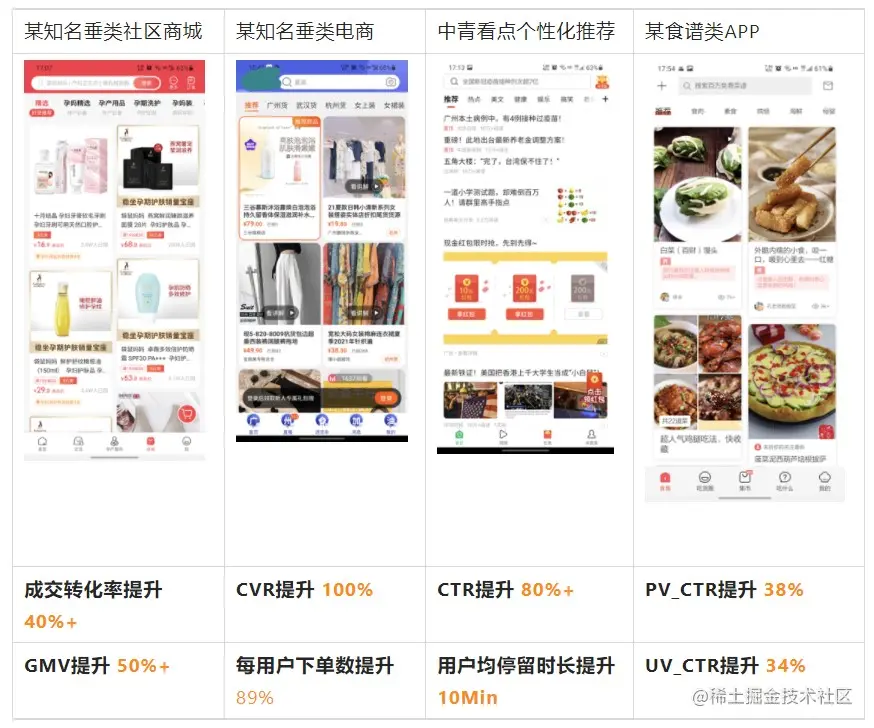 从下图表中可以看出,在企业使用完智能推荐之后,各项效果指标有了明显的提升。