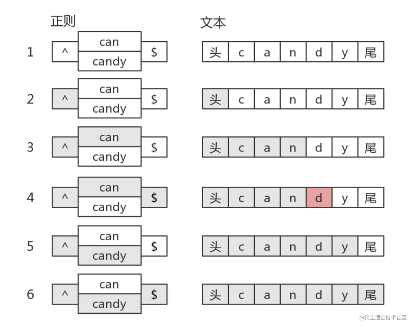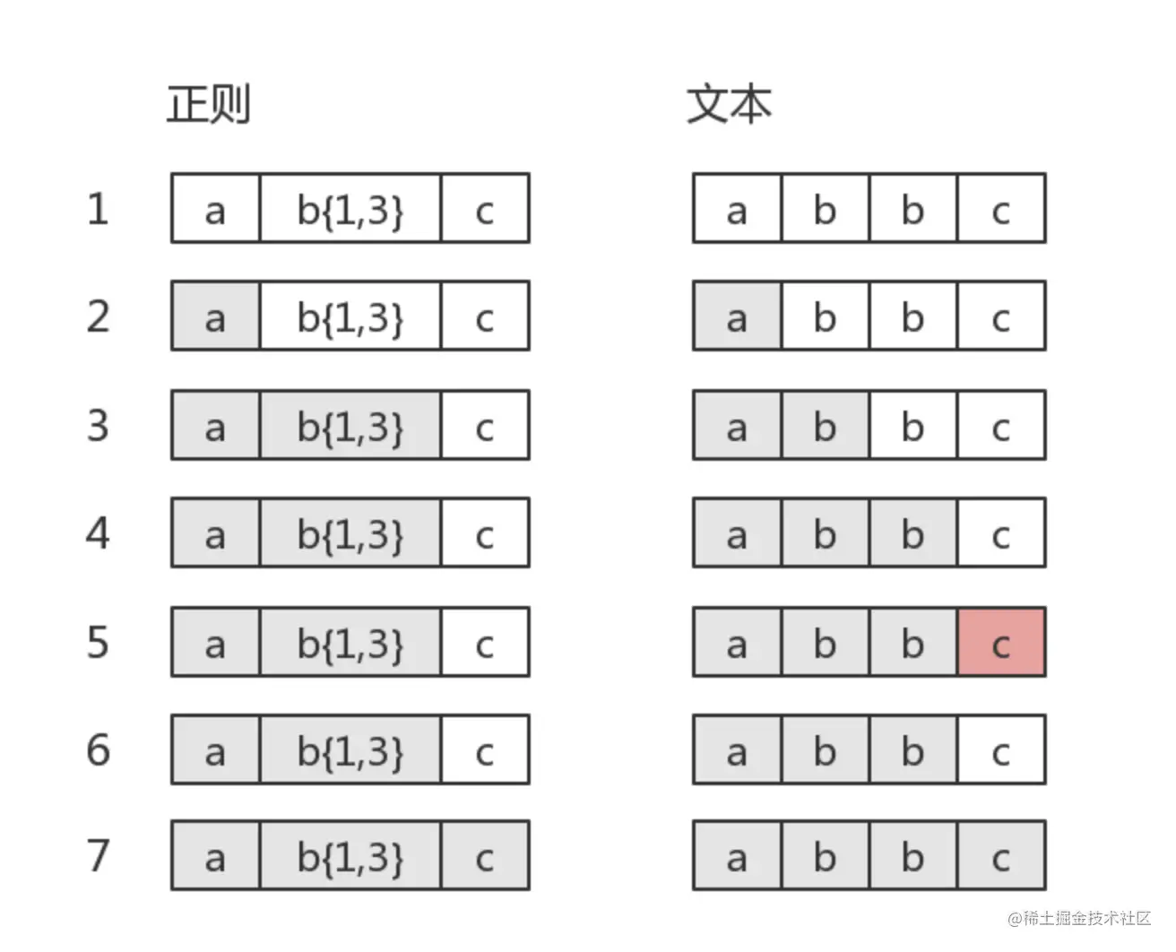 - 再根据正则看字符串后面是不是 c,发现不是,此时 c 分支淘汰,文本回退。