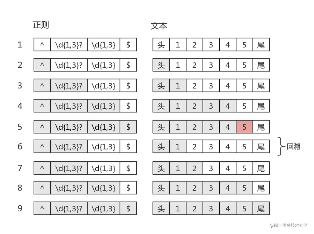 回溯过程,后面匹配不上,会继续递增的去匹配更长;