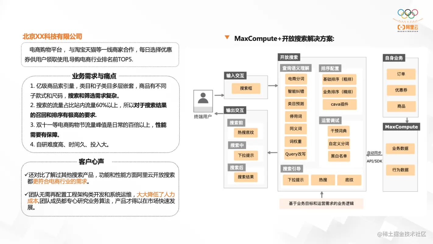 下面简单介绍两个电商、零售行业搜索的典型客户案例。一家电商购物平台类APP,为用户提供商品搜索、优惠券导购等功能。客户最开始选择自研搜索开发,但很快就遇到了一些瓶颈,比如在亿级商品索引量下,复杂的搜索、筛选需求经常会影响搜索性能,特别是在电商大促期间,流量峰值会大幅提升。用户调研了多种产品及解决方案之后,最终选择了MaxCompute+开放搜索的解决方案。MaxCompute 灵活弹性运维机制高度适用电商行业场景,而开放搜索能够为搜索业务提供性能、效果保障。在持续使用了一段时间之后,我们得到了客户良好的反馈,特别是工程、运维上的稳定保障,使得用户能够专心研究业务与算法,推动产品营收与发展。