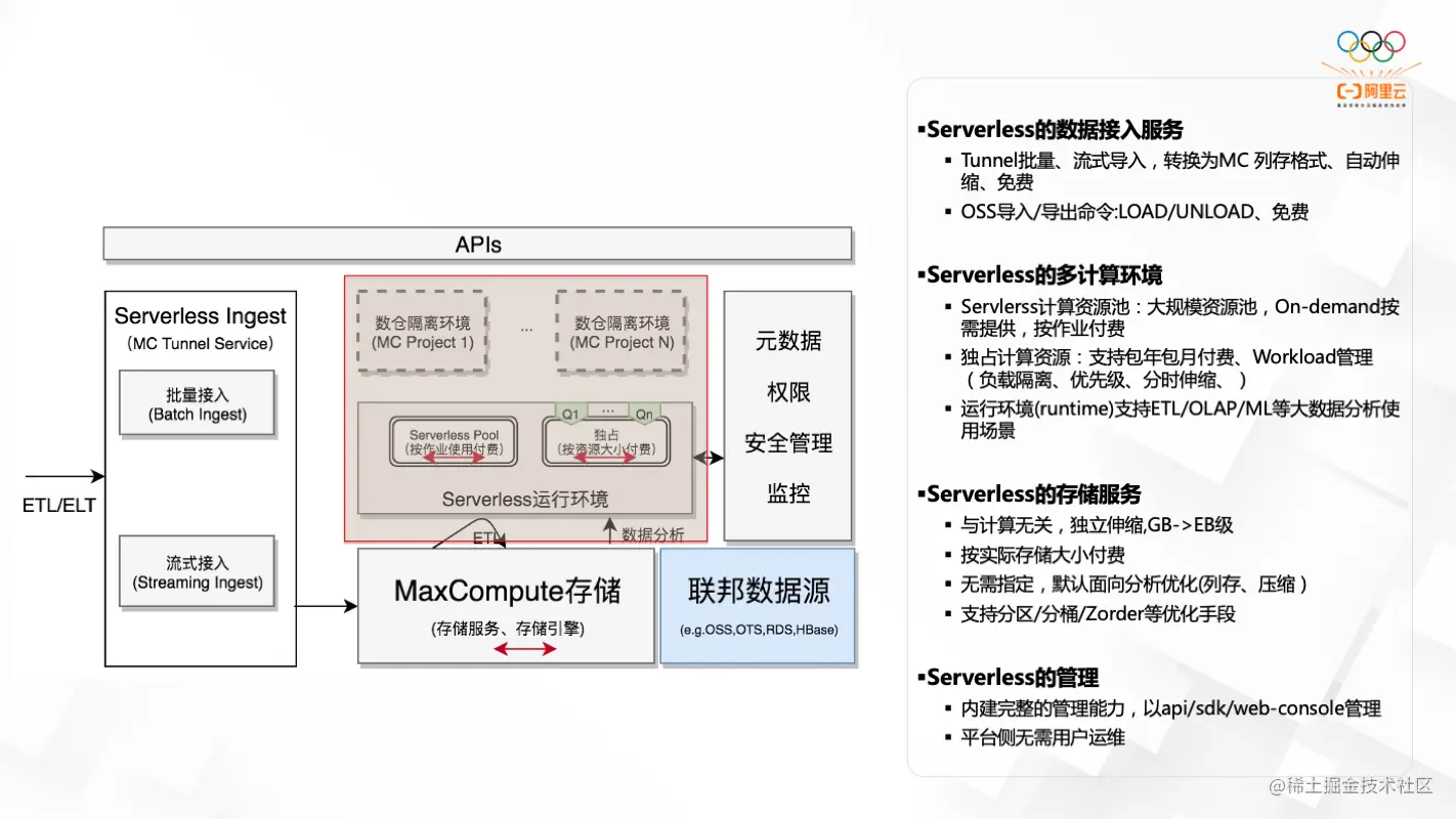 此外,MaxCompute 还提供Serverless的数据接入服务、多计算环境、存储服务、资源管理,大幅度降低用户运维成本,让用户更专注自身业务扩展与开发。