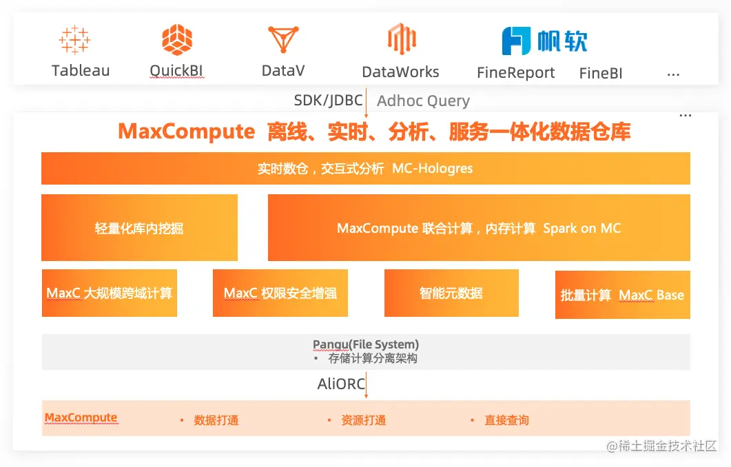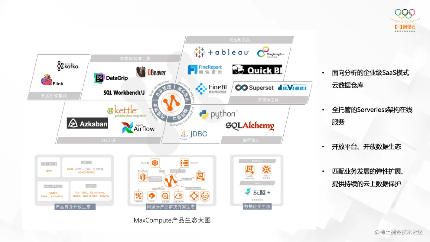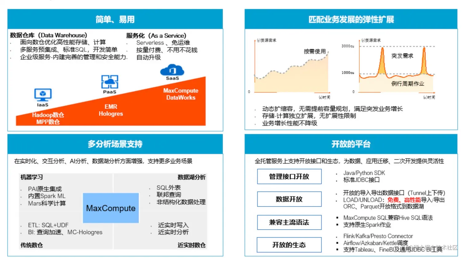 MaxCompute 是阿里云推出的一款简单、易用、全托管的面向分析的企业级 Saas 模式云数据仓库,它简单、易用,能够匹配业务发展进行灵活弹性扩展;面向云上开发者,MaxCompute 支持机器学习、数据湖、传统数仓、近实时数仓等多种业务分析场景,并提供更开放的开发生态。