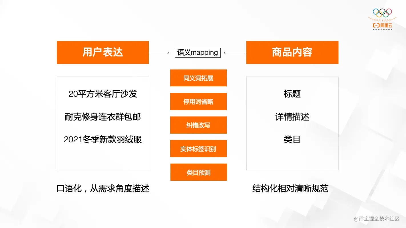 首先,我们需要理解用户的实际搜索意图,之前我们提到过,电商行业用户在输入搜索Query时,有时会带有一些口语化表达,或者会进行关键词堆砌。因此,我们需要将用户从购买需求角度描述的Query转化为结构化的相对清晰规范的表达形式,这就是用户意图识别流程。