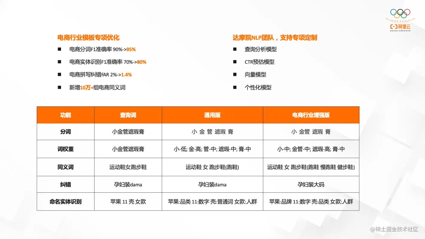 在电商通用分词器基础之上,我们与达摩院自然语言处理团队合作进行了电商行业模板专项优化,提出电商增强版分析器和相应的查询分析算法。具体来看,将电商分词F1分词准确率提升至95%,实体识别F1准确率提升至80%,拼写纠错FAR降低至1.4%,同时还新增了超过10万条的电商同义词,这些效果均处于NLP电商领域的领先水平。