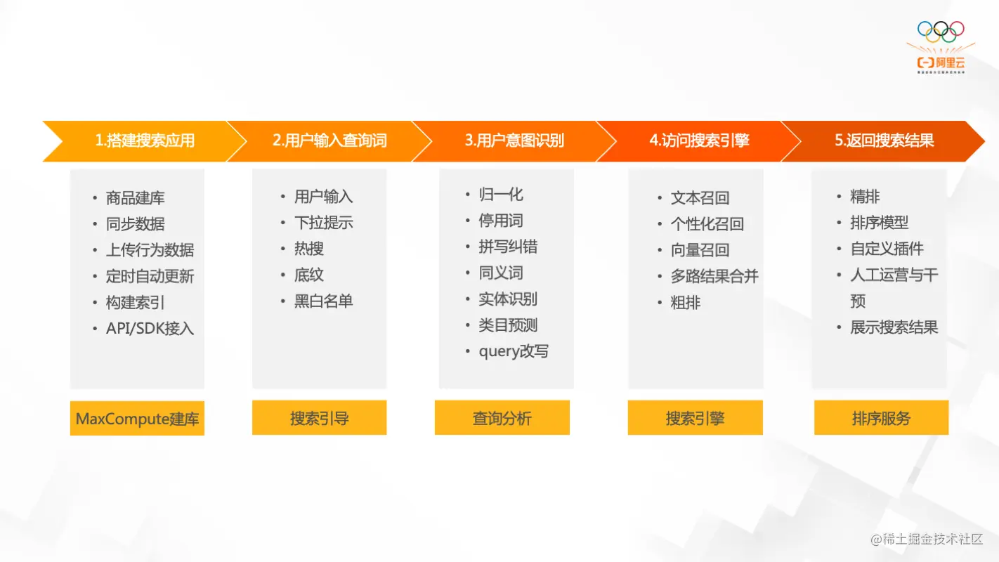 这一解决方案可以根据用户实际搜索行为,拆解为搭建搜索应用、用户输入查询词、用户意图识别、访问搜索引擎、返回搜索结果五个关键环节,分别对应MaxCompute建库、搜索引导、查询分析、搜索引擎、排序服务五个模块的开发。