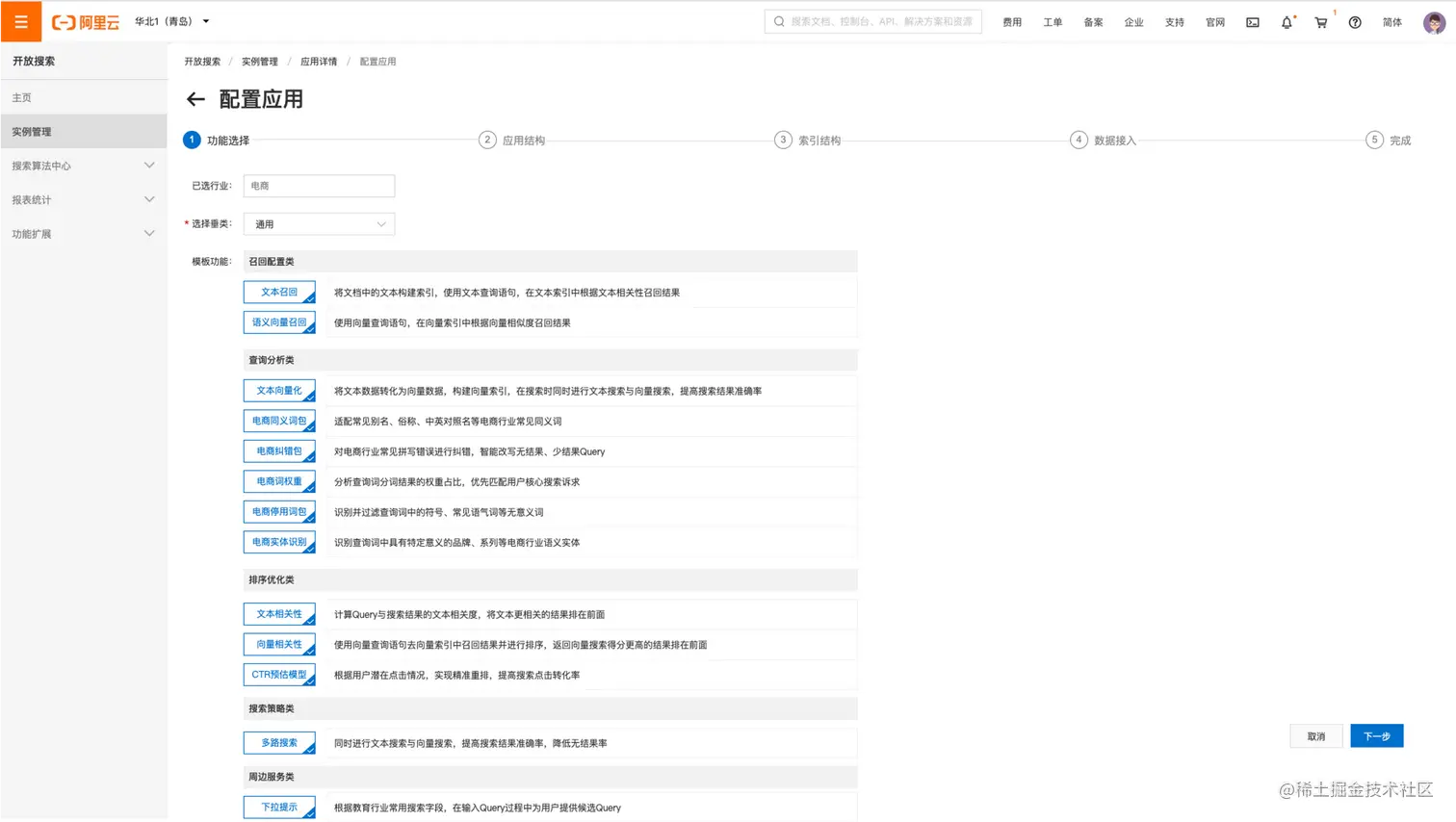 针对电商用户特别是刚刚开始云上互联网转型的零售行业用户,我们提供了一键式配置能力,用户只需在控制台上勾选想要实现的召回、查询分析、排序、周边服务等搜索相关功能,即可自动生成相应的应用结构、索引结构以及各具体功能策略,实现电商搜索全方位一键式配置。