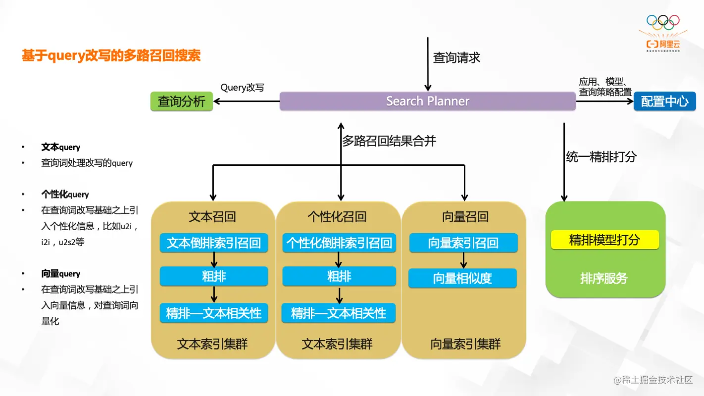 在完成Query改写之后,会进入搜索引擎召回阶段。开放搜索提供包含文本召回、个性化召回、向量召回在内的多种召回策略。文本召回是搜索领域最常见的召回策略,会对比改写后Query与商品数据中的文本相关性,利用倒排索引实现召回。开放搜索使用阿里巴巴集团内部自研的问天3文本搜索引擎,能够高性能的处理高并发、多写入场景下的搜索任务,更快的返回搜索结果。个性化召回会在查询词改写基础上引入用户的个性化信息,返回面向用户的千人千面的个性化搜索结果。向量召回会在改写词基础上引入向量信息,根据查询词与商品数据的向量相似度返回搜索结果。传统文本搜索可能会遗漏部分看上去没有相关性但实际上也是用户目标需求的搜索结果,而向量召回可以解决这一问题。利用文本召回和向量召回同时进行多路搜索,能大幅度降低搜索结果的无结果率,优化搜索效果。