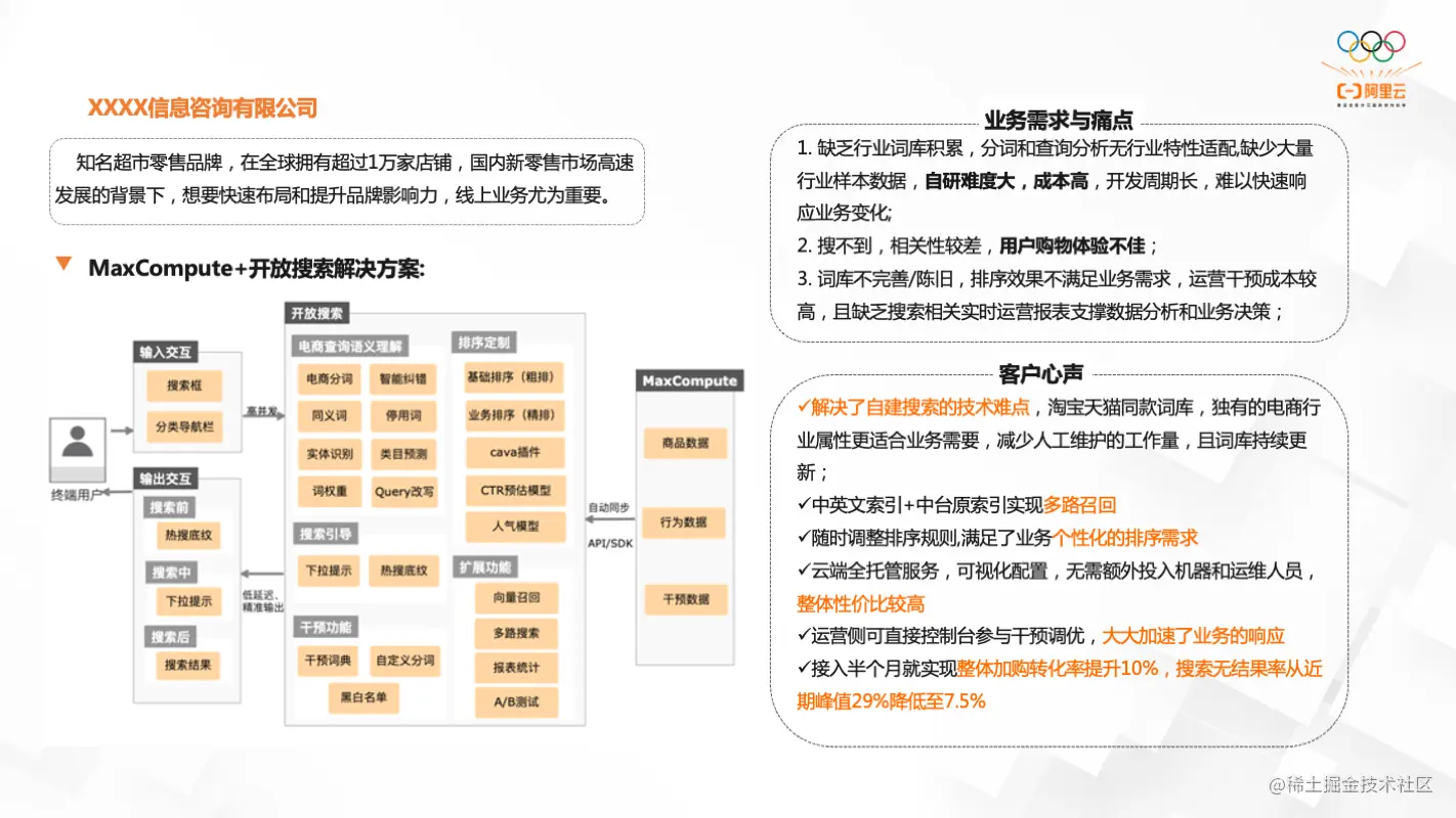 另一家用户是近期刚刚接入的零售行业用户。这是一家在全球用于超过一万家店铺的超市零售品牌,在国内新零售市场高速发展的背景下,想要快速布局和提升品牌影响力,线上业务尤为重要。用户最初同样选择了自研搜索方案并应用到了线上商城,但效果远远没有达到预期,用户购物体验不佳。最近用户接入了开放搜索电商行业模板,利用内置的多路召回、个性化排序等功能,大幅提升了搜索效果。在接入半个月之后,整体加购转化率提升10%,无结果率从29%大幅降低至7.5%。另外用户还特别提到MaxCompute+开放搜索的云端全托管服务模型,大幅降低了人员投入和运维成本,用户超高的整体性价比。