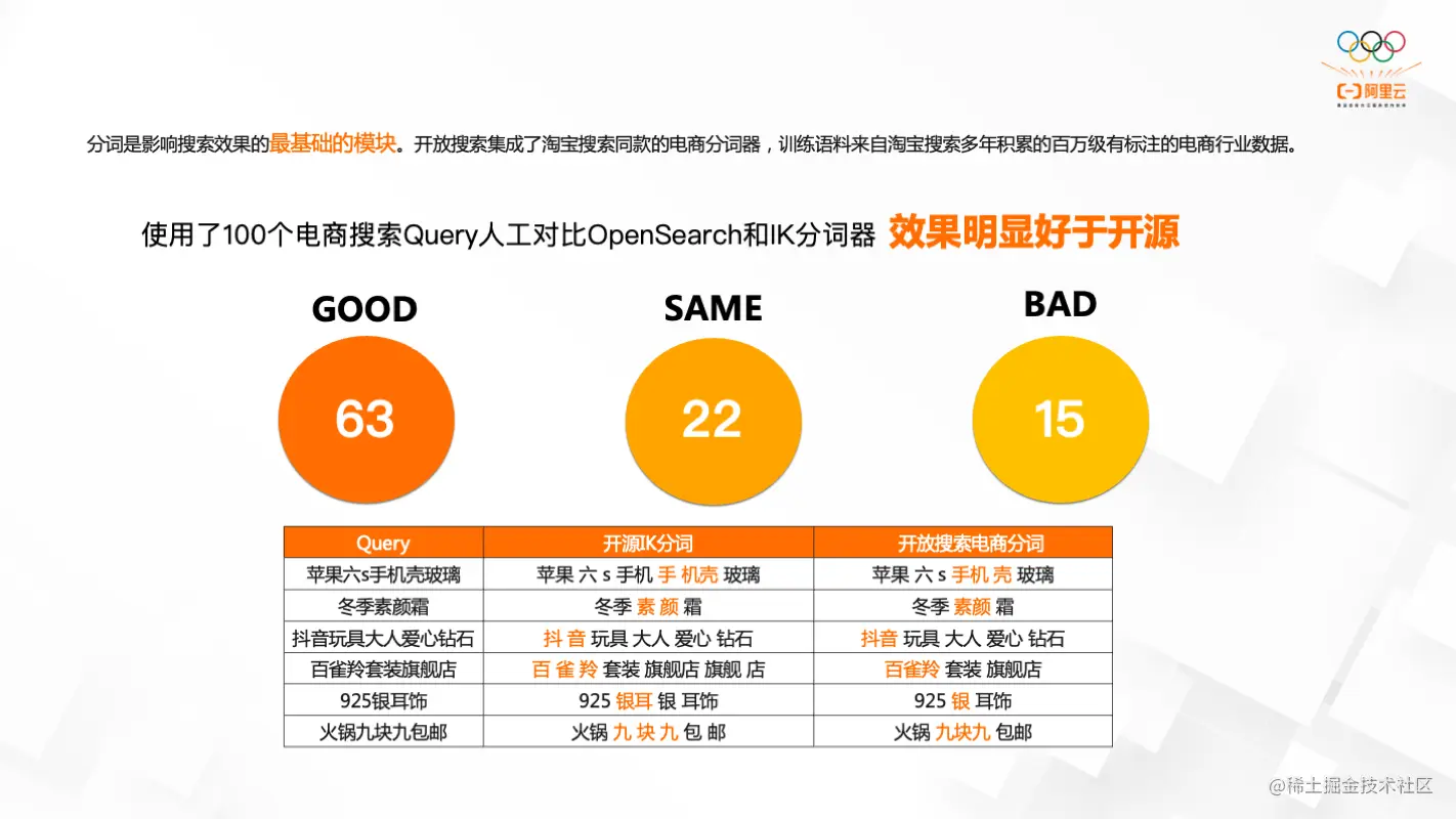 首先,分词是搜索中最基础的也是中文搜索不可缺少的环节。针对电商、零售行业,开放搜索集成了淘宝搜索团款的电商分词器,模型训练语料来自淘宝搜索多年积累的百万级有标注的电商行业数据。我们将开放搜索通用的电商分词器与开源IK分词器进行了效果对比,在100个电商搜索实际Query中,有63个Query的分词结果优于开源分词器。Good、bad比例超过4:1。