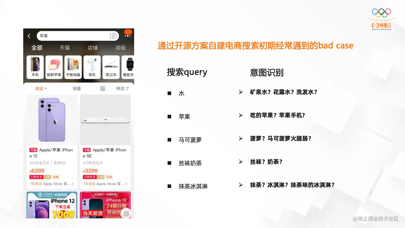 在用户意图识别方面,不同用户在不同场景下输入同一词汇时,可能会覆盖多种领域的众多商品。比如当用户输入苹果时,他可能指的是手机、水果、平板电脑、耳机、笔记本等多种品类。这也是通过开源方案自建电商搜索初期经常遇到的badcase之一。