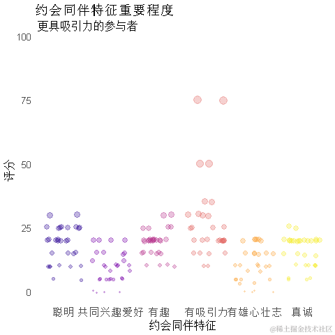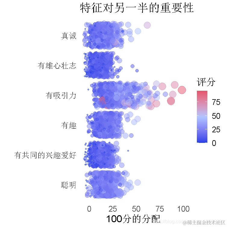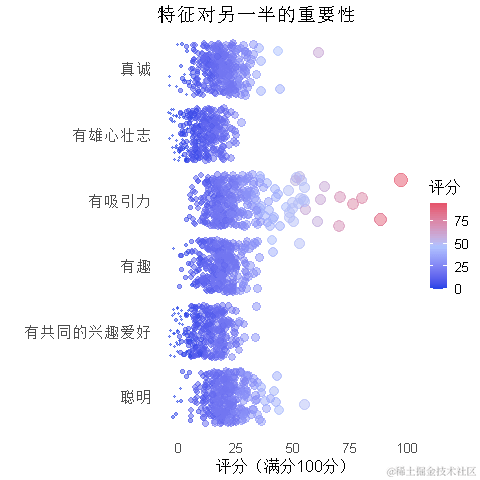 首先,我们要探讨快速约会实验的参与者在伴侣中寻找什么。参与者被要求对潜在约会对象中的属性的重要性进行评分,将100分的预算分配给几个特征,数值越高表示越重要。参与者被要求根据他们自己的观点对这些属性进行评分。