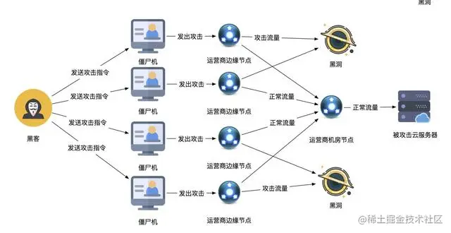 一般来说,服务商会帮你承担少量的攻击,因为很多时候可能是探测流量等,并非真实的攻击,如果每次都丢入黑洞,用户体验极差。 DDoS攻击是我们共同的敌人,大多数云计算平台已经尽力为客户免费防御了大多数的DDoS,也和客户共同承担DDoS的风险。当你受到了大规模 DDoS 攻击后,你不是唯一一个受害者,整个机房、集群都会受到严重的影响,所有的服务的稳定性都无法保障。 除此之外,在上面我们说到,目前 DDoS 都是带宽消耗型攻击,带宽消耗攻击型想要解决就需要提升带宽,但是,机房本身最大的成本便是带宽费用。而带宽是机房向电信、联通、移动等通信运营商购买的,运营商的计费是按照带宽进行计费的,而运营商在计费时,是不会将 DDoS 的攻击流量清洗掉的,而是也算入计费中,就导致机房需要承担高昂的费用。如果你不承担相应的费用,机房的无奈之下的选择自然便是将你的服务器丢入黑洞。