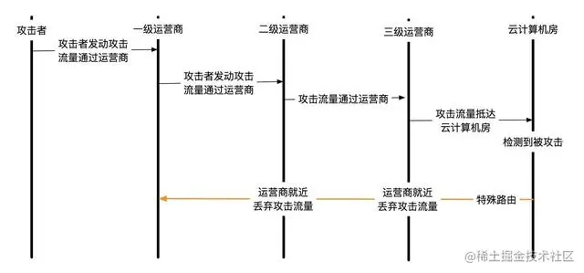 后来,黑洞进一步升级,在机房黑洞之上采用了运营商联动黑洞。在遇到大流量攻击时,DDoS防御系统调用运营商黑洞,在运营商侧丢弃流量,可以大大缓解DDoS攻击对机房带宽的压力。