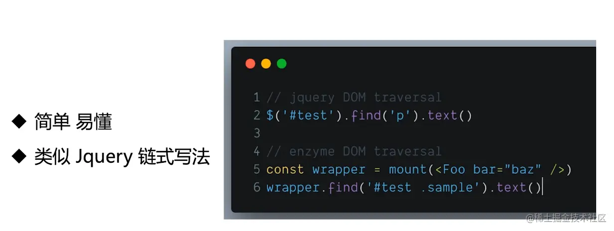 Enzyme是Airbnb开源的React测试工具库库,它功能过对官方的测试工具库ReactTestUtils的二次封装,提供了一套简洁强大的 API,并内置Cheerio,