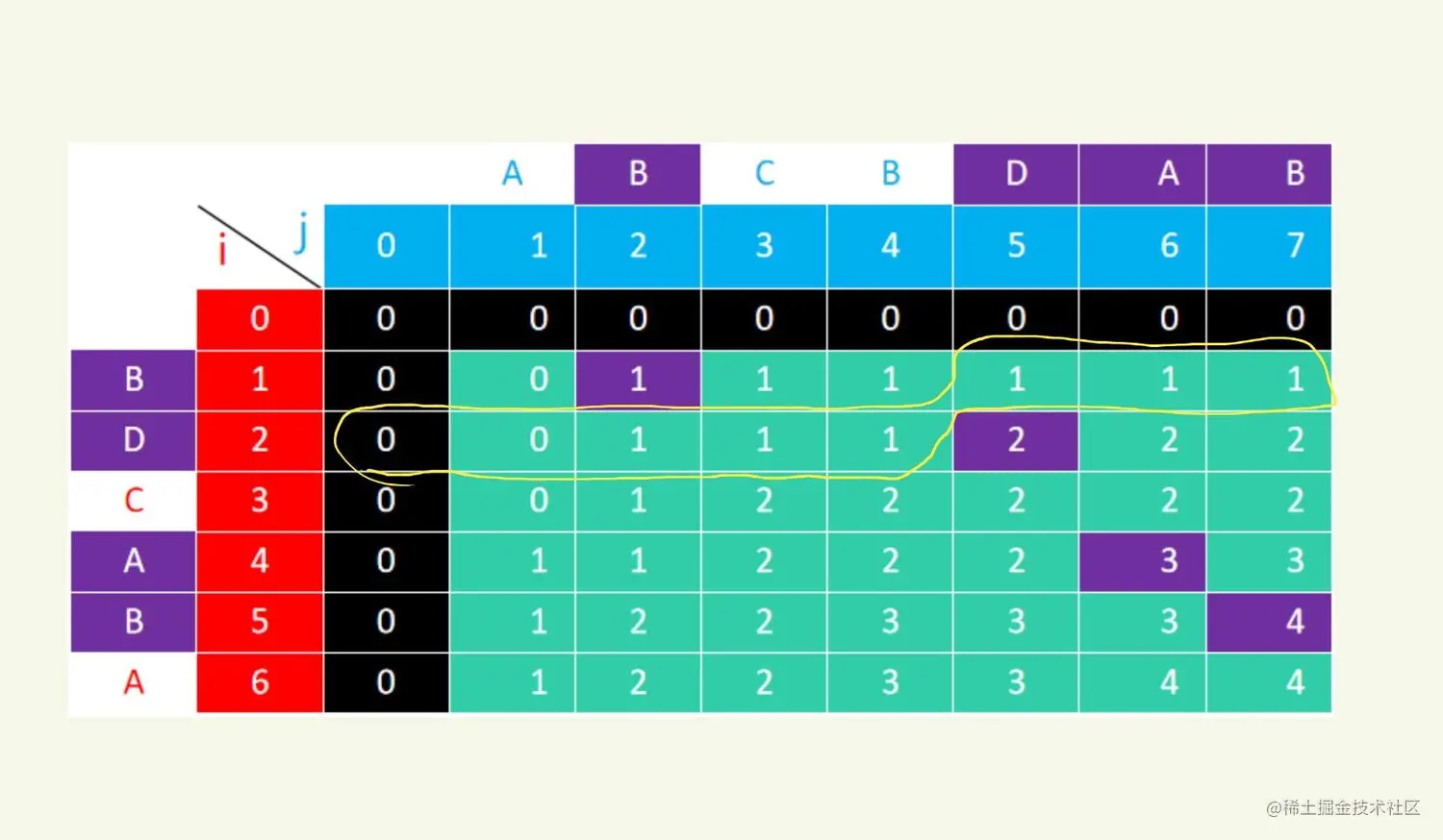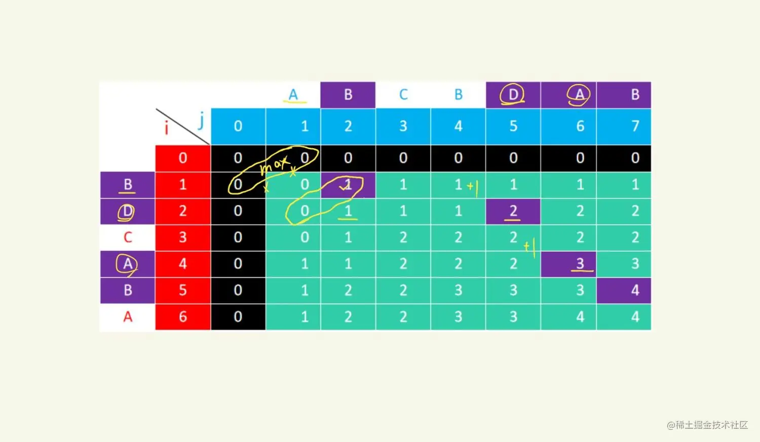 ABCBDAB 和 BDCABA 的最长公共子序列长度是 4,可能是