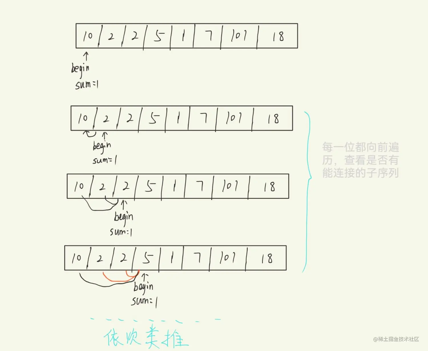 假设数组是 nums, [10, 2, 2, 5, 1, 7, 101, 18]