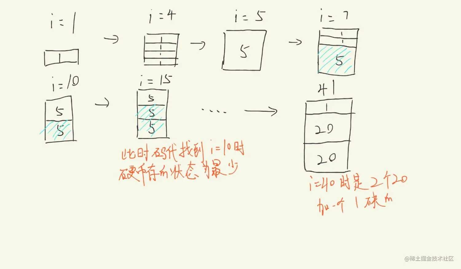 它是从较小的值开始计算,如果n为41,那我们就从1开始计算,根据代码所示,在四之前我们都是用价值为1的硬币,当达到五之后我们用价值为5的硬币,……