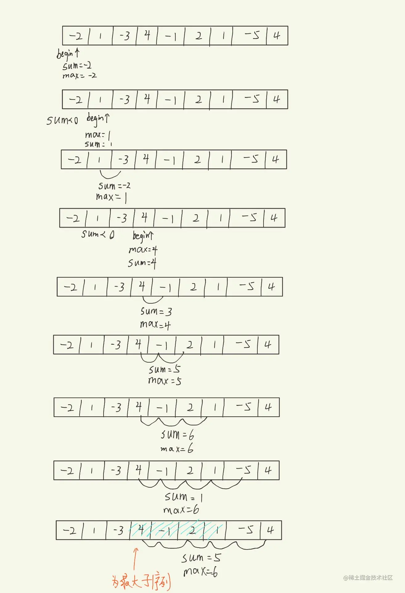 以 nums[7] –5 结尾的最大连续子序列是 4、–1、2、1、–5,所以 dp(7) = dp(6) + (–5) = 1