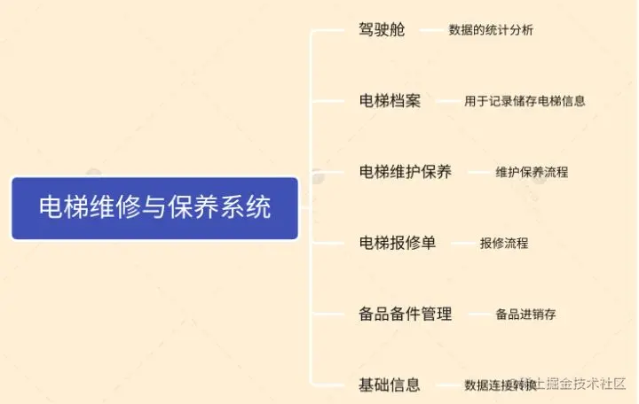 如图 1.2所示,划分为六个大的板块,分别是驾驶舱、电梯档案、电梯维护保养、电梯报修单、备品备件管理、基础信息。每个板块都有实现的功能。