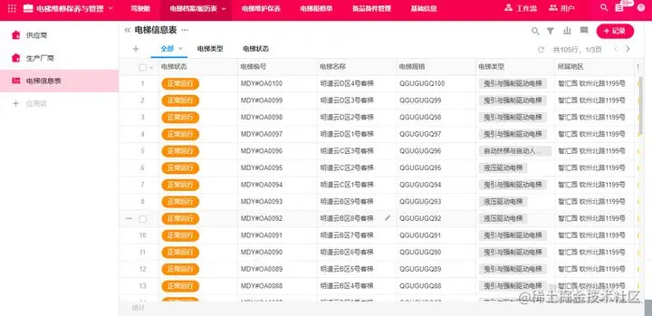 有了基础信息之后,就需要建立我们电梯档案,我们对电梯的属性进行划分:状态、编号、名称、规格、类型、安装地点、负责人、生产商、供应商等,对电梯信息进行储存记录。