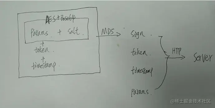 - 将请求参数(一般是json形式)加上约定好的salt进行AES加密,加密出来的是byte,一般用base64进行转码输出,也可做位偏移,得到一个加密字符串;然后加上后端的token,加上时间戳,进行MD5加密得到一个定长的sign字符串
