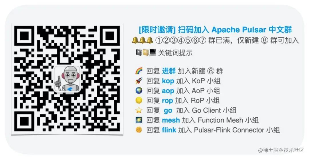 我叫侯盛鑫,也可以我叫大云,目前就职于伴鱼基础架构,负责消息队列的维护与相关开发,Rust 日报小组中的菜鸡成员,喜欢研究存储,服务治理等方向。初次接触 Pulsar 就对存储和计算分离的结构所吸引,顺滑的生产者消费者接入和高吞吐让我好奇这个项目的实现,期望之后能在 Pulsar 的相关功能中做些贡献。