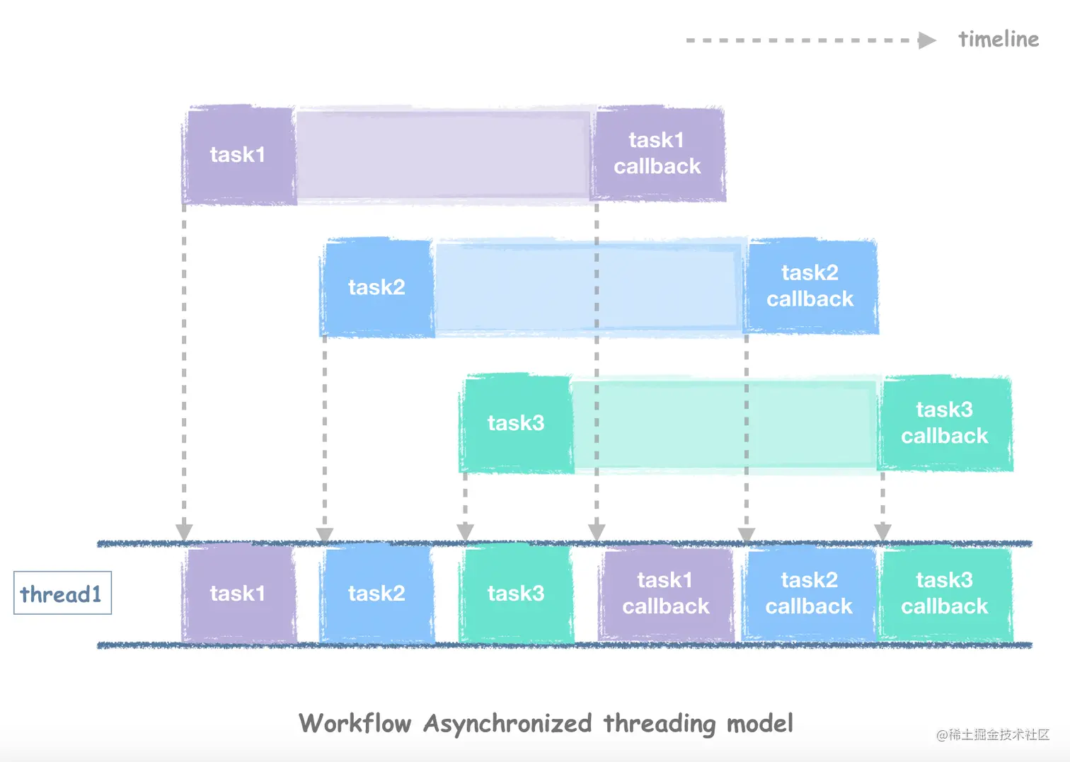 同步和异步的模式直接决定了我们的Http Client可以有多大的并发度。为什么呢?通过下图可以先看看同步框架发起三个Http任务,线程模型是怎样的: