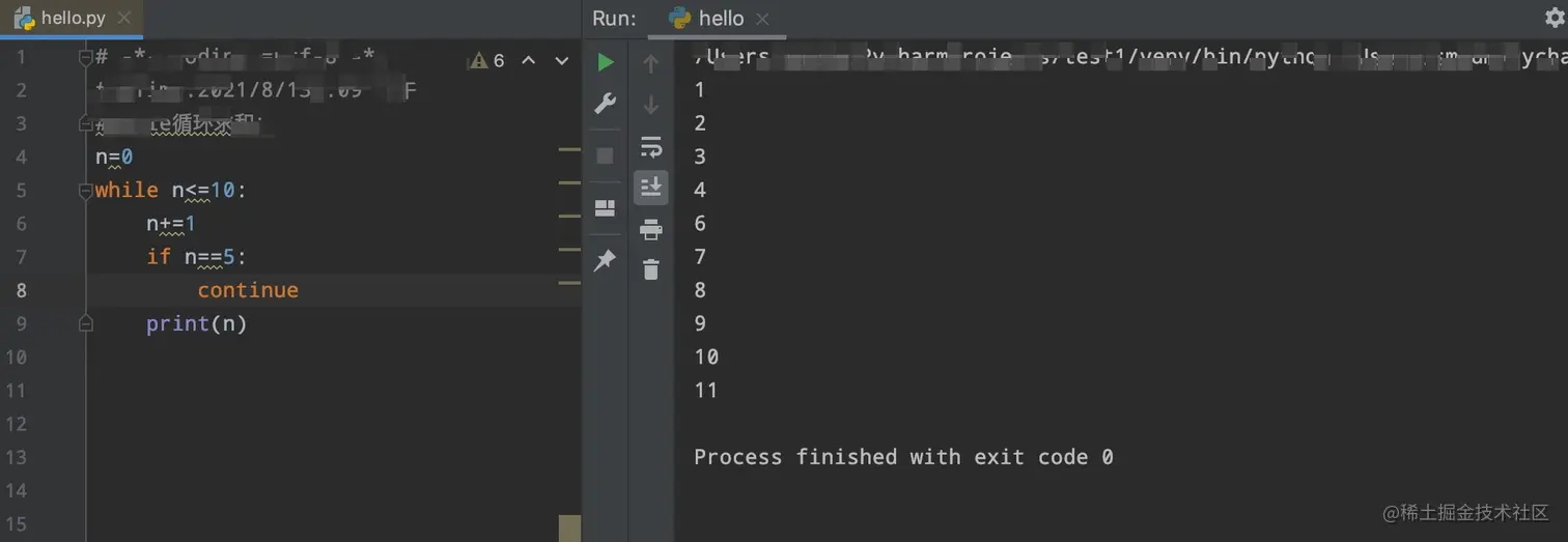 continue 当n等于5时,继续执行循环体,不再往下执行,向上找循环体,