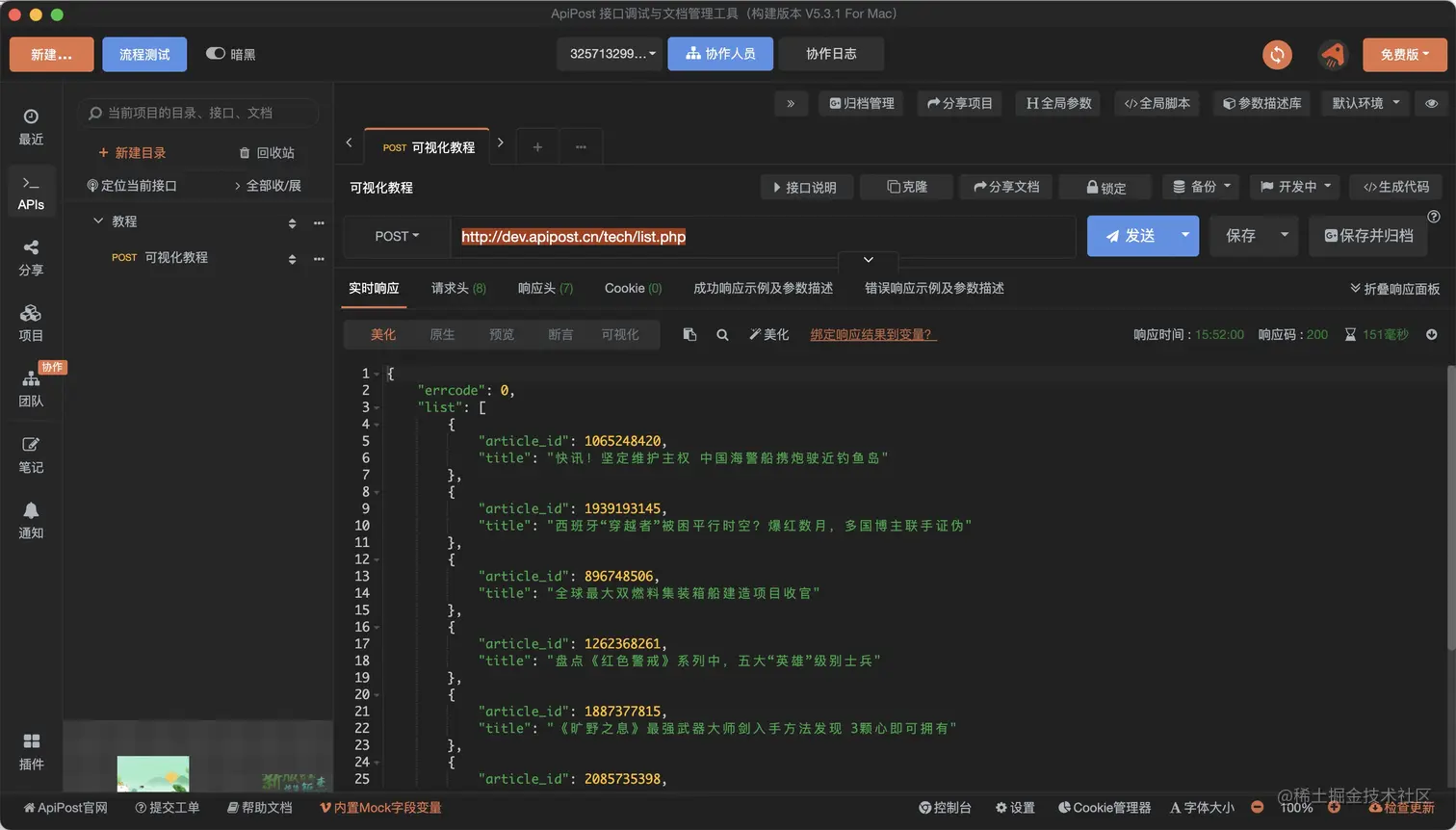 从ApiPost V5.3.1版本开始,我们在后执行脚本中新增了apt.Visualizing(template, obj) 方法,用于实现响应可视化。以上效果的实现代码如下(放到接口的后执行脚本):