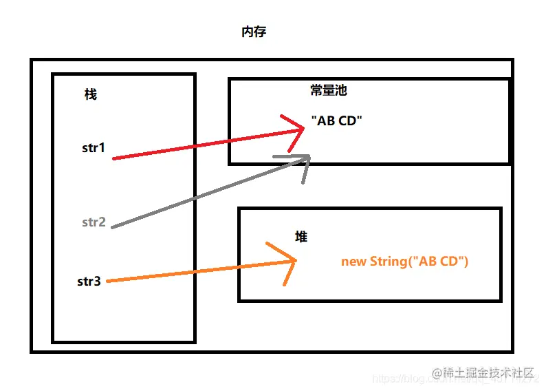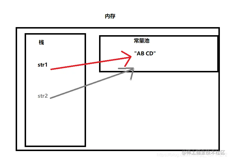 1.当执行String str1 = "AB CD;"语句时,会在内存的栈空间中创建一个str1,在常量池中创建一个"AB CD",并将str1指向hello。