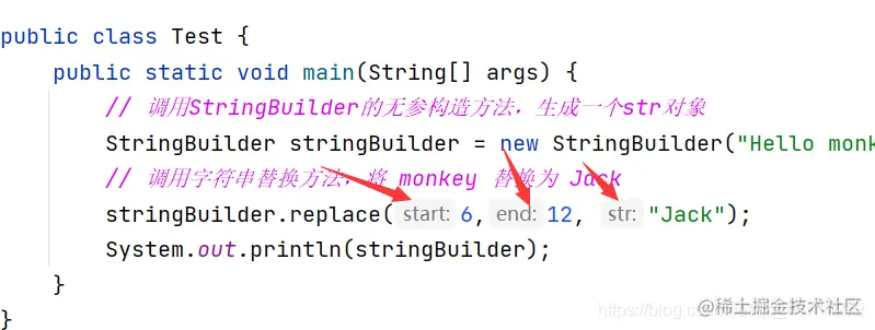 也可使用 StringBuilder delete(int start, int end) 方法,先来删除索引位置 start 开始到 end 索引位置(不包含 end)的子串,再使用 StringBuilder insert(int offset, String str) 方法,将字符串插入到序列的 offset 索引位置。同样可以实现字符串的替换,例如: