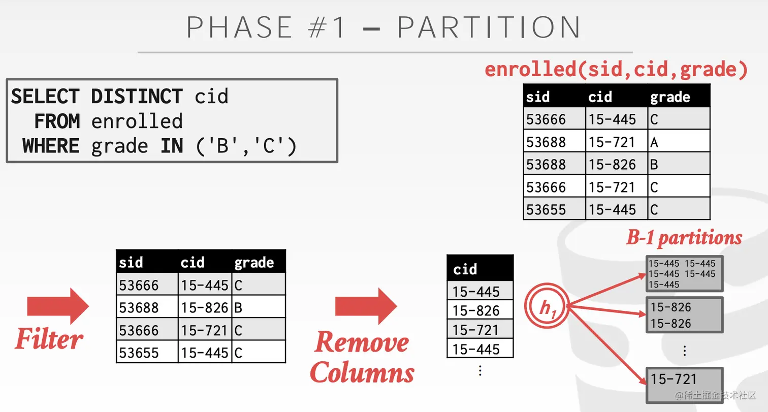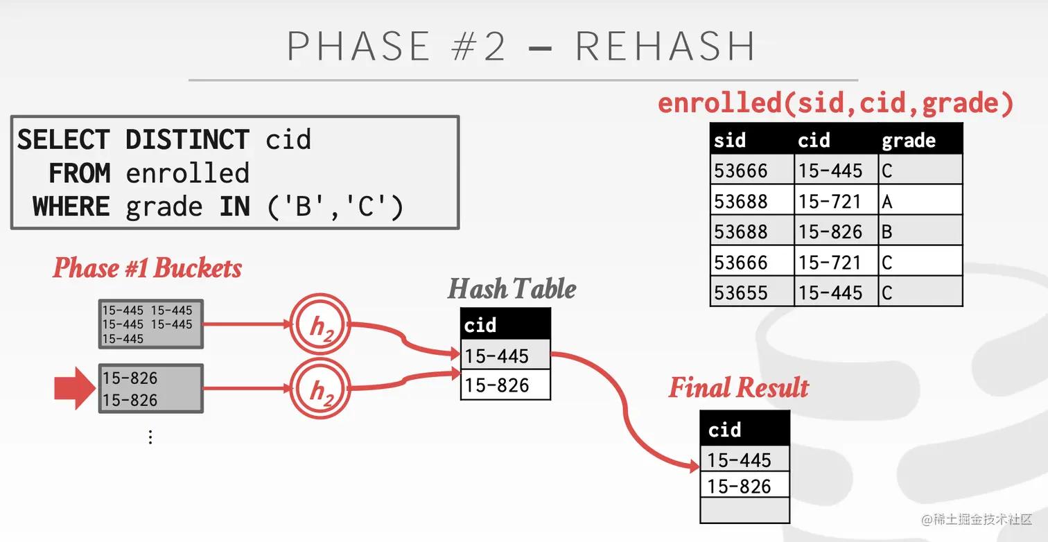 - phase2:rehash,对每个分区构建内存中的哈希表,然后做相应的计算。
