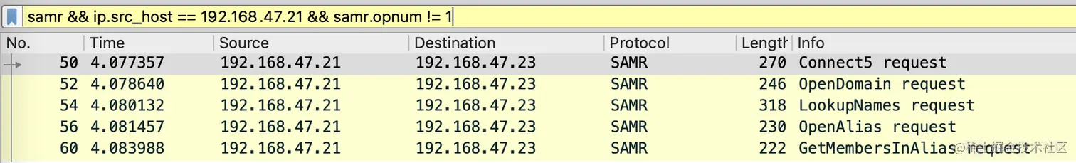通常进行本地管理员组账户的枚举会调用NetLocalGroupGetMembers()这一API,前面提到过这类API底层也是调用MS-SAMR协议,先来看一下正常调用的过程: