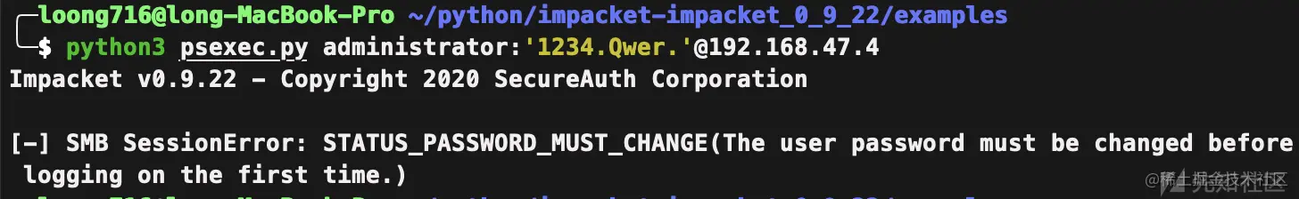 假设在渗透测试过程中,我们收集到一台服务器的用户账户,但当想要访问目标SMB资源时,发现该账户密码已过期。此处以psexec横向为例,目标显示STATUS_PASSWORD_MUST_CHANGE错误: