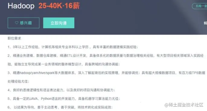 当做想找Hadoop工程师的工作时,你会发现,很多的企业对Hadoop工程师的要求中,具备Java语言精湛编程技能的要求是必不可少的。与不擅长Java编程的普通Hadoop专家相比,它不仅提高了市场竞争能力,而且精通Hadoop的Java程序员也可以看到自己的职业和薪水增长而没有阻碍。