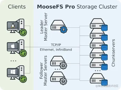 MooseFS正好是这个架构,如官方示意图所示,它将元数据服务称之为Master Server,将数据服务称之为Chunk Server。