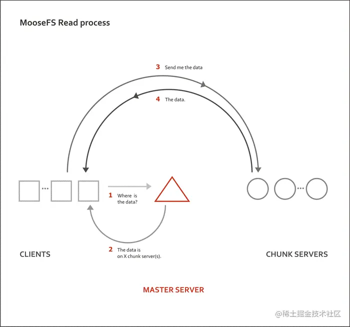 读流程示意图,需特别注意的是MooseFS所有副本都能提供读: