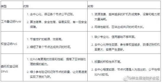 工作量证明 PoW 主要是依靠计算机性能决定记账,性能越高,就越有机会获取记账的权利;但是这会导致大量资源的浪费。这时权益证明 PoS 出现了,主要解决 PoW 机制中大量资源被浪费的情况,即参与者持有币的时间越长,难题越简单,挖到币的概率越大;但是容易产生垄断。在 PoS 基础上设计出了委托权益证明 DPoS,类似于投票选举的共识算法。相对于 PoW 和 PoS,DPOS 机制最大的优点之一是共识达成的周期要短很多。
