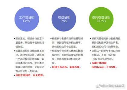 接下来,简单介绍区块链应用中常见的这三种共识算法:工作量证明 PoW(Proof of Work), 权益证明 PoS(Proof of Stake),委托权益证明 DPoS(Delegated Proof of Stake)。如图所示: