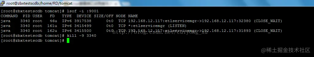3.既然知道进程号,那杀死当前进程就简单多了,直接kill -9 3340 回车,终止当前的进程