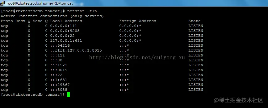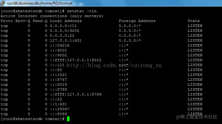 1.输入netstat -tln,查看系统当前所有被占用端口,主要是为了查看你的端口是否真正地被占用着,大家可以看到我的9001,和9002端口都已经被占用了,所以我需要释放这两个端口