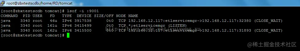 2.根据端口查询进程,输入lsof -i :9001,切记不要忘了添加冒号,如下图,就可以看到当前被占用的端口的进程Id
