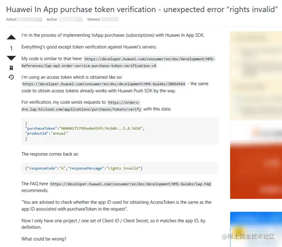 有海外开发者向我们提问:我在应用中集成了华为应用内支付SDK(测试购买订阅型商品),按照文档说明,在服务器去请求验证购买Token接口的时候返回了{"responseCode":"6","responseMessage":"rights invalid"}。此错误在文档FAQ中有提到:建议优先检查获取AccessToken时的appid和实际请求参数purchaseToken关联的appid是否同一个。我只有一组项目,一组客户端ID及客户端秘钥,因此按理说appid应该是相同的。我不知道是哪里有问题? 我该怎么配置。