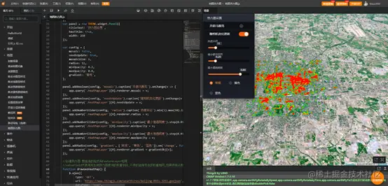 ThingJS能够快速实现在地图中添加热力图图层,左侧面板可对热力图各种参数进行调整。